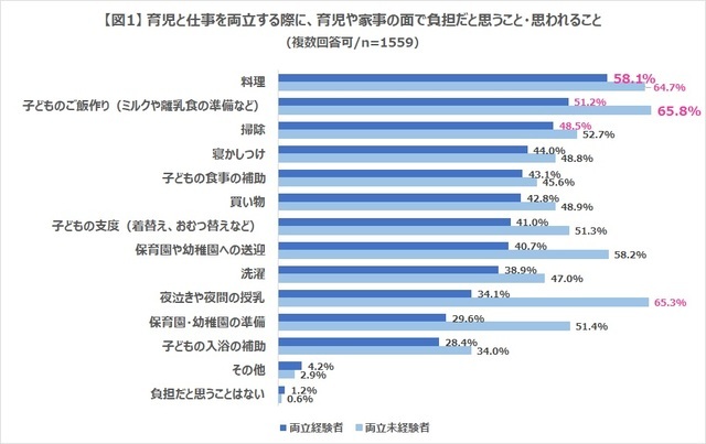 負担に思う育児・家事 第1位は、両立経験ありの方は「料理」、両立経験なしの方は「子どものご飯作り」