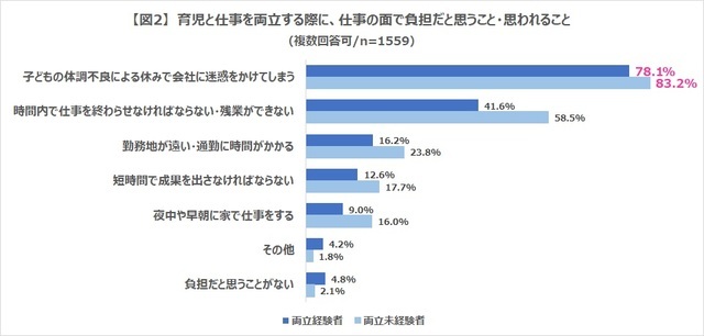 両立経験者が思う仕事面での負担は、「子どもの体調不良による休みで会社に迷惑をかけてしまう」
