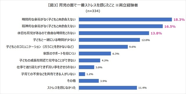 両立経験者にとって、育児の面で一番ストレスに感じたことは「時間的な余裕がなく子どもと向き合えない」で18.3%