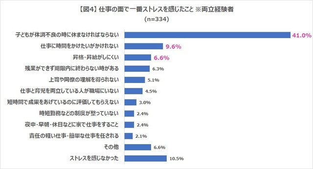 - ▼両立経験者にとって、仕事の面で一番ストレスに感じたことは「子どもが体調不良の時に休まなければならない」で41.0%