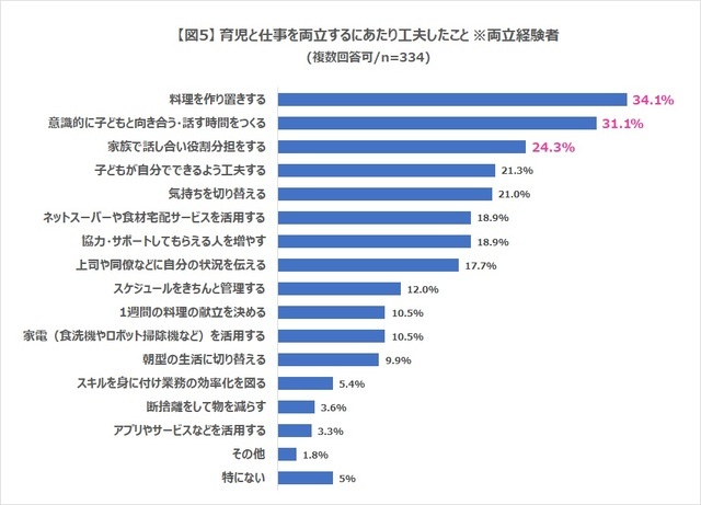 両立経験があり「料理」と回答した方からは「仕事が終わって保育園に迎えに行ってからの夕飯の支度は、子どもがぐずったり一緒に遊びたがると一向に進まない。でも、ご飯を食べないとお風呂も寝ることも出来ないので早くしなきゃいけない、と思うととてもストレス」という声が。