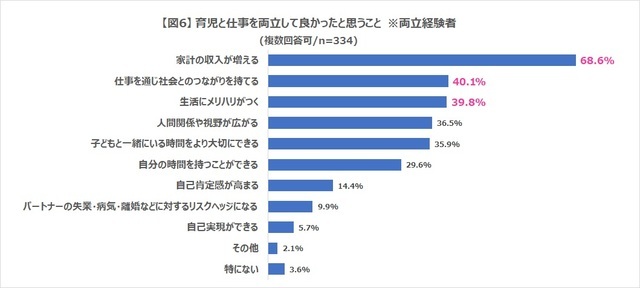 - ▼両立経験ありの方の約7割が、育児と仕事を両立して良かったと思うことは「家計の収入が増える」と回答