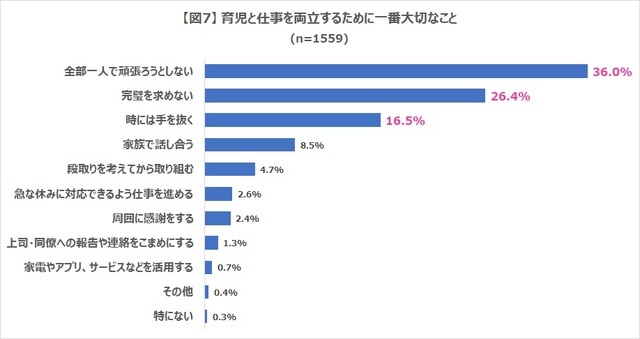 - ▼育児と仕事を両立するために一番大切なことは、「全部一人で頑張ろうとしない」で36.0%