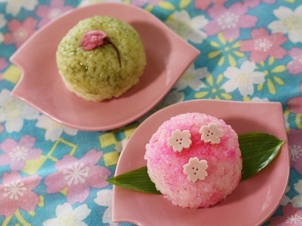 4.塩抜きした桜を緑のおにぎりに貼り付け、魚肉ソーセージの桜を桜でんぶおにぎりにはりつければできあがりです。