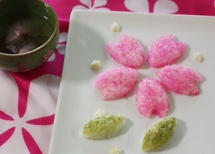 ご飯、桜でんぶ、デコふり(緑)、桜の花びらの型、ラップ