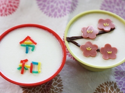 【1】カラフルな『令和』グミと梅の花チョコの杏仁プリン