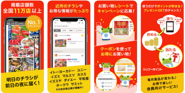 | 特徴 | 毎月8枚まで無料で写真がプリントできる。 | 1枚6円からきれいな画質で印刷できる。 | 低価格でフォトブックが作れる。 | 無料で毎月1冊のフォトブックが作れる。 | 写真をスキャンしてデータ化できる。 | 人気のキャラクターフォトブックが作れる。 | 耳で聞く読書アプリ。世界の童話シリーズなどもある。 | 家庭のさまざまなお金の動きを一括で管理できる。 | スーパー、ドラッグストアの特売チラシが前日の夜からチェックできる。 | 自分の好きなルールで自動的に貯金ができる。 | 銀行口座や電子マネーと連携して、家計の支出を自動で管理できる。 | お得なクーポンやエンタメ、世界情勢のニュースなど情報が満載! | 全国の漁港から鮮魚を直送してくれるサービス。 | チャット形式でAIがお部屋探しをサポートしてくれる。 |