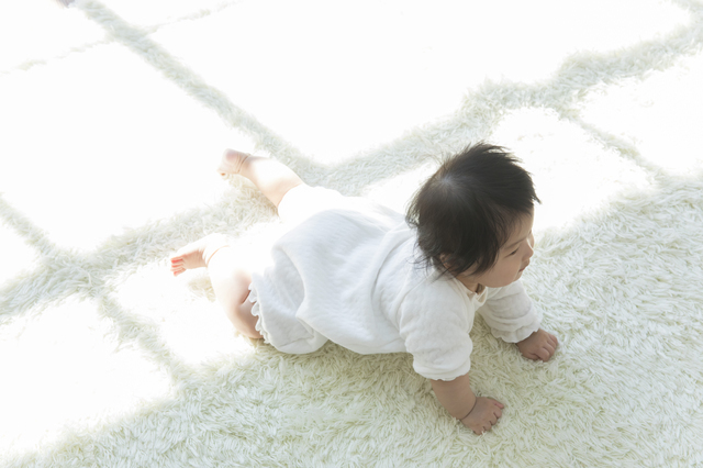 床の上ではいはいをしていると、膝が痛くなったり、転んだ時に頭をぶつけたりすることがあります。赤ちゃんが安全にハイハイできるように、厚みのあるジョイントマットやじゅうたんを床に敷くと良いですよ。