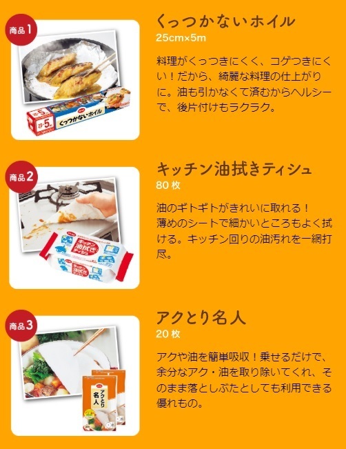 「コープデリ」は3種類のキッチングッズ(写真上:①くっつかないホイル②キッチン油拭きティシュ③アクとり名人)がもらえますよ~
