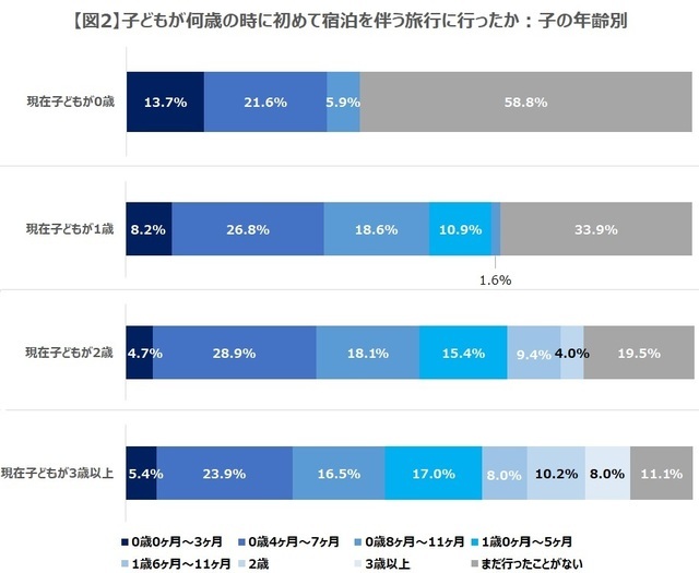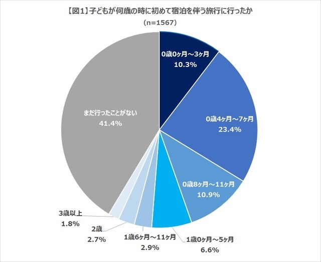 ●子連れで初めて宿泊を伴う旅行に行く時期は「0歳4ヶ月~7ヶ月」が23.4%で最多