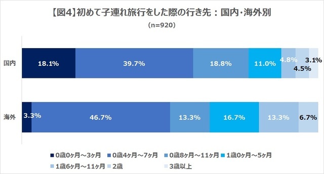 国内と海外の行き先別に、初めて旅行した時期を見てみると、海外へ行った方は「0歳4ヶ月~7ヶ月」の割合が国内よりも高くなりました。0歳4ヶ月~0歳7ヶ月は、母乳やミルクがメインの時期なのでフライトの際の耳抜きがしやすく、子どもが寝る時間もまだ長いので、比較的に海外へ旅行をしやすい時期であると言えそうです。