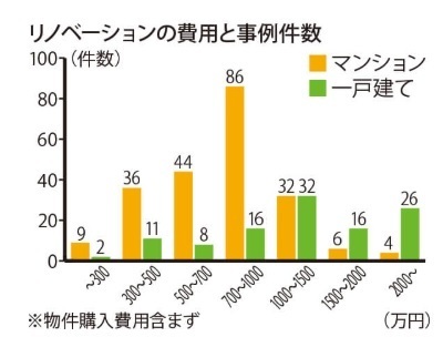 出典:www.homes.co.jpLIFULL HOME’S(ライフルホームズ)調べ(上図)によると、マンションのリノベーションでは700~1,000万円程度をかける割合が一番多く、戸建てになると1,000万~1,500万円程度が最多、2,000万円以上かける場合も少なくありません。