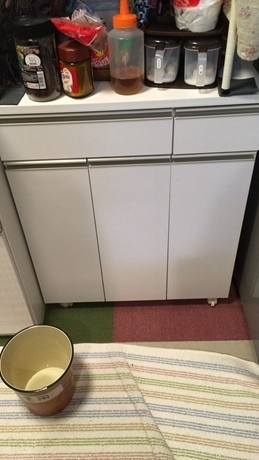 賃貸で高さの高い食器棚を置くことが難しいため、3段カラーボックスを5つ繋げて、引き出しをつけ、キッチン向かいのスペースに置いてます。