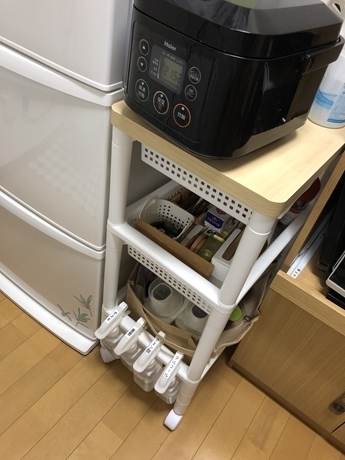 食器棚を探していましたが、どれも高価だったため、ニトリの三段ボックスにしました。(ニトリやIKEAなどいろんなところで探しました。)2つ並べてキッチンに置いていますが、大きさはバッチリ。また、上に炊飯器と電子レンジを置くこともできます。