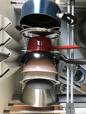 我が家は調理機器が重ねられないので、ニトリのフライパンスタンドを購入しました。フライパンやフタが立てて収納でき、便利でした。またフックで厚みも変えられるのでいろいろな種類のフライパンやフタが収納でき重宝しています。