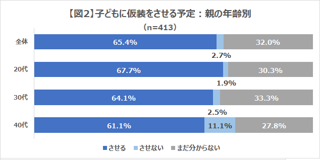 ●親の年齢が若いほど、子どもに仮装をさせる人の割合が高い。仮装するママパパは少数派