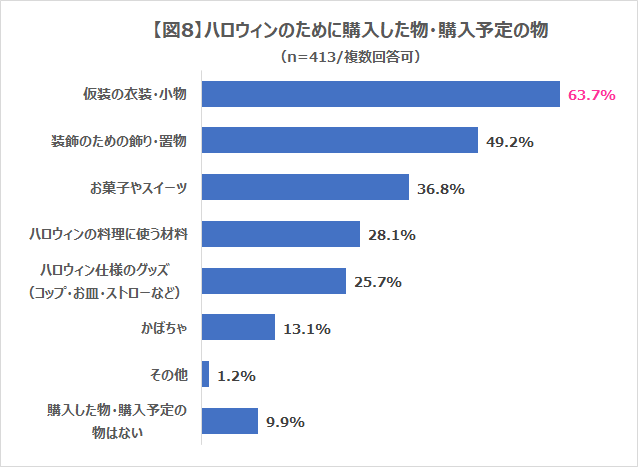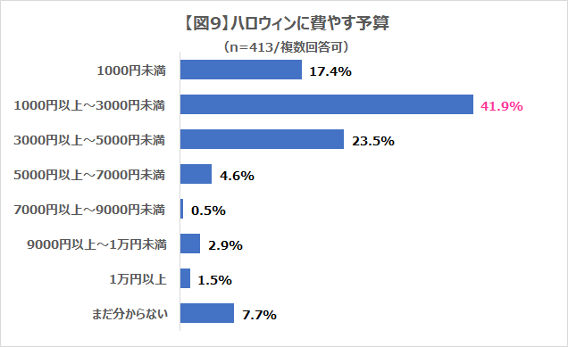 ハロウィンのために購入した物は1位「仮装の衣装・小物」で、予算は「1000円以上~3000円未満」が最多。