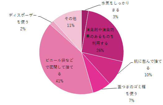 夏場の暑い時期はビニール袋に密閉してゴミ箱に捨ててもすごい臭いがしてコバエが飛んでたりしたので袋だけでは意味がなかったので、カインズホームのフローラルの匂いがついている消臭スプレーを購入して使用したら本当に嫌な臭い臭いが消えました。