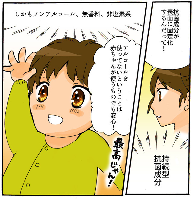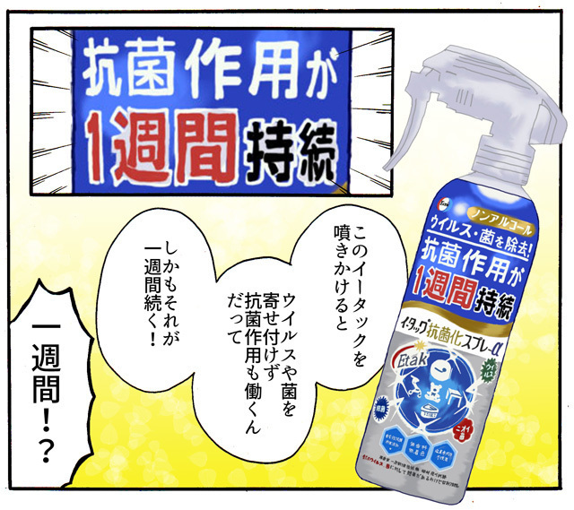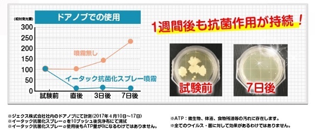 出典:www.eisai.jp特許を取得しているEtak®(持続型抗菌成分イータック)によって、一回の使用で1週間後まで抗菌作用をキープ!噴きかけてから、乾燥した後でもその効果がちゃんと持続するのです。