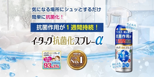 出典:www.eisai.jpママパパが出入りする時にさわるドアノブ、赤ちゃんがねんねしたり、ずいりばいやあんよをする床をはじめ、テーブルやイスなどの家具、たちまち増えてしまう育児用品など、おうちの中の場所やモノにはイータック抗菌化スプレーαがあれば、気になるところにシュッシュッ!