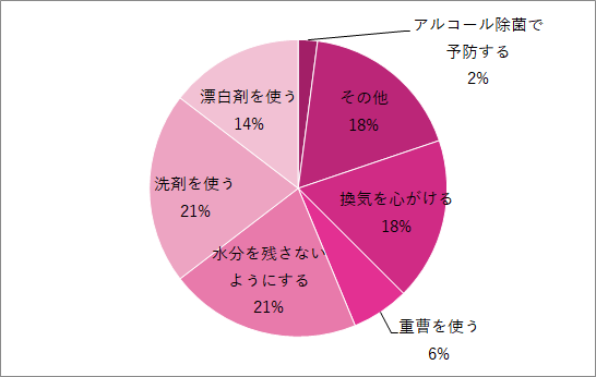 - ▼A.やってよかった「お風呂のピンク汚れ対策」は、「洗剤を使う、水分を残さないようにする」が21%!