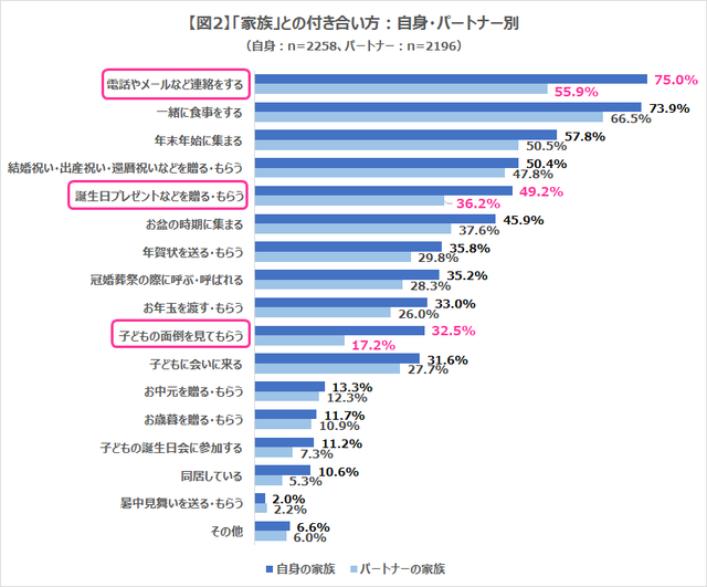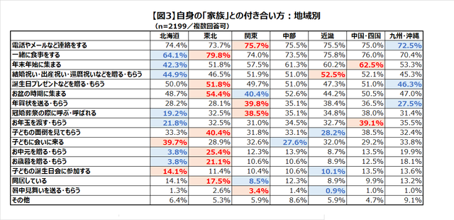 自身の「家族」との付き合い方について、回答者の住んでいるエリア別にみてみたところ、付き合いの有無についてはほぼ地域差がなかったにも関わらず、付き合い方については地域差が出ました(図3)。付き合い方の割合が最も高い・低いで比較した際に、10%以上差が出た項目と地域・割合をピックアップしてご紹介しましょう!