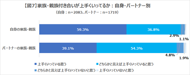 ・「パートナーの家族・親族に関してはとにかく一歩引くことと、合わない部分は、(どうしても我慢しなければいけないところ以外は)無理に合わせようとしないようにしています。どうしても我慢しないといけない時の不満はすべてパートナーにぶつけるのと、折衝はすべてパートナーに任せています。そのかわり、自分の家族・親族は自分が担当しています。」(はせめぐさん)