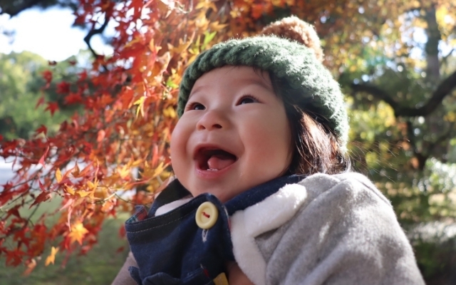赤や黄色の鮮やかな紅葉を嬉々とした表情で見ている赤ちゃんがとってもかわいいですね!