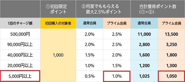 また二回目以降も、チャージする度に購入金額の最大2.5%のポイントが貯まります。