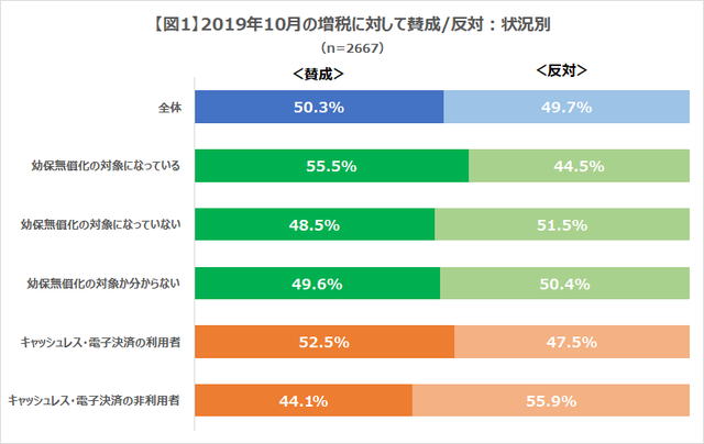2019年10月より消費税が増税となりましたが、同時に幼児教育・保育無償化やキャッシュレスのポイント還元策など、子育て世帯にメリットがある制度も始まりました。そういったことも含めて、コズレ会員のママパパに増税について「賛成」か「反対」かを伺ったところ、「賛成」は50.3%、「反対」は49.7%という結果になりました。