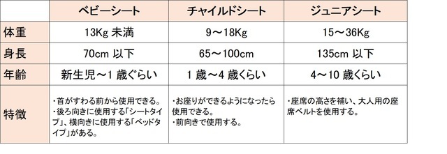 年齢以外の体の成長で見てみると体重13kg以下・身長70cm以下だとベビーシート。体重が9kg~18kg、身長が65cm~100cmくらいだとチャイルドシート。体重が15Kg~36Kg、身長が135cm以下だとジュニアシートを使います。