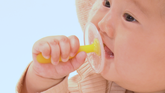 まず自分みがきの練習として、赤ちゃん本人に歯ぐきマッサージ用のブラシをくわえてカミカミしてもらいます。これが、自分で歯をみがくことに慣れる練習になります。