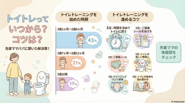 多くのお子さんが2歳頃から始めていること、時間を決めて親がトイレを促してあげると成功しやすいことが分かりました。
