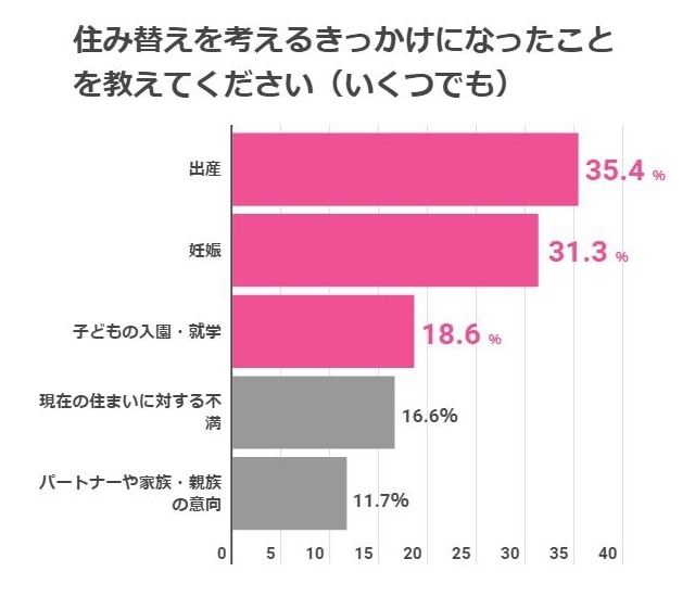 1歳、2歳の子どもはまだまだ手のかかる年齢ではあるものの、ママの体力が戻ってきて引越し準備がしやすかったり、住み替えによる子ども絡みのご近所トラブルが減ることでの安心感がとても大きかったりすることが、こうした結果の理由かもしれません。