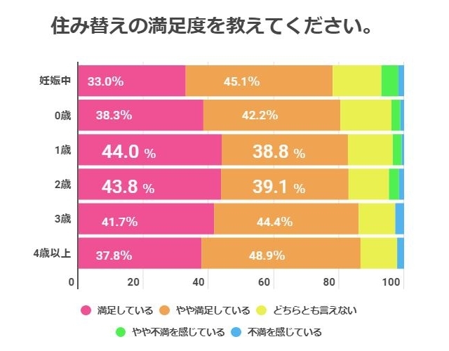 妊娠中から4歳以上まで、どの時期にもメリット・デメリットがあることがわかりましたが、住み替えに対してどの程度満足しているのでしょうか?