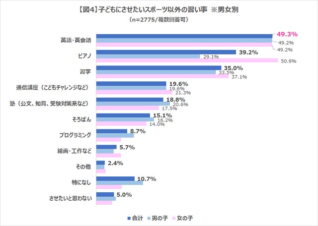 子どもにさせたいスポーツ以外の習い事ランキングで1位は「英語・英会話」、2位は「ピアノ」、3位は「習字」、4位「通信講座」、5位「塾」となりました(図4)。男の子・女の子別で見てみると、スポーツ以外の習い事でも差異がありました。