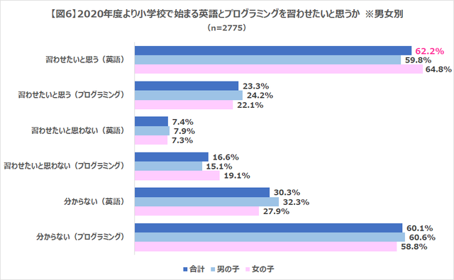 そういった背景をふまえ、英語とプログラミングを子どもに習わせたいと思うかどうかを尋ねたところ、「英語を習わせたいと思う」が62.2%だったのに対し、「プログラミングを習わせたいと思う」は23.3%と差がある結果となりました(図6)。