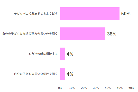 「子ども同士で解決させるよう促す」ママパパが多いということが分かりました。初めは、大人が間に入って気持ちを表現できるように促していくと、自然と子ども同士で解決できるようになっていくようですね。相手に嫌な思いをさせてしまった場合には、気持ちを想像させてあげることも大切なようです。