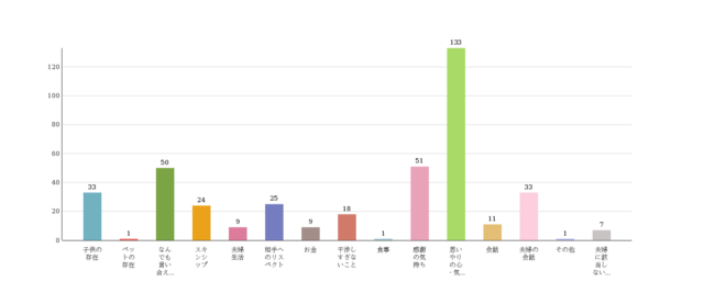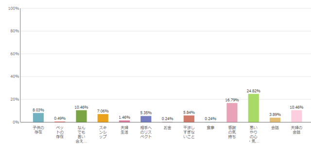 2位は「感謝の気持ち」で12.41%。夫婦であっても、やってもらったことに「ありがとう」と感謝の気持ちを表すことで、お互いへの信頼や愛情が伝わりやすくなるもの。やって当たり前、と日ごろの細かな声掛けを忘れてしまいがちな人も多いですが、見直す価値はあるかもしれません。