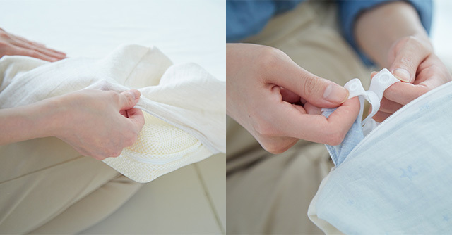 シーツ換えは、面倒な作業のひとつ。しかも、汚してしまった時はすぐに交換したいですよね。今回セットに入っているフィットシーツは、ゴムでセットできるので超簡単に取り替えが可能。