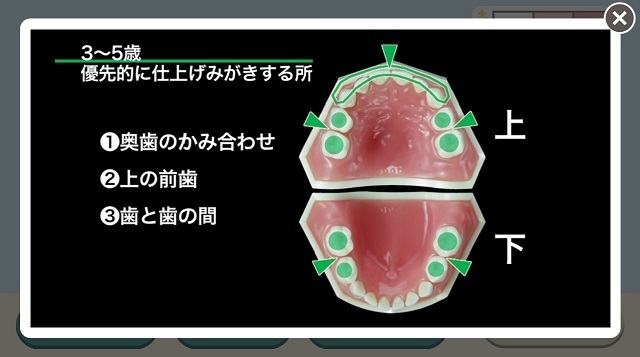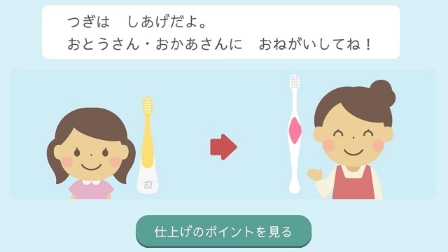子どもからママパパにバトンタッチ!親向けの画面では、より的確に具体的な歯みがきポイントを解説。