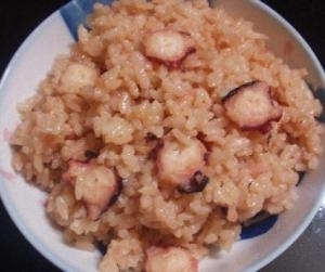 ②お米を炊飯器に入れ、だし汁と調味料を加え、規定の目盛りの水加減にしてから、たこの足を入れて炊飯する。