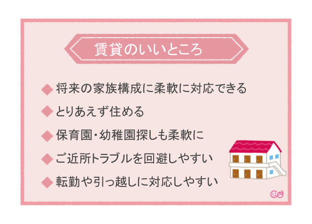 賃貸のいいところは、家族の環境や場所などを柔軟に選べること。特に第1子が誕生後のご家族だと将来的な家族の人数がわからない、決まっていないことがあります。これからの将来設計をまだ決めきれていない、というファミリーにおすすめです。