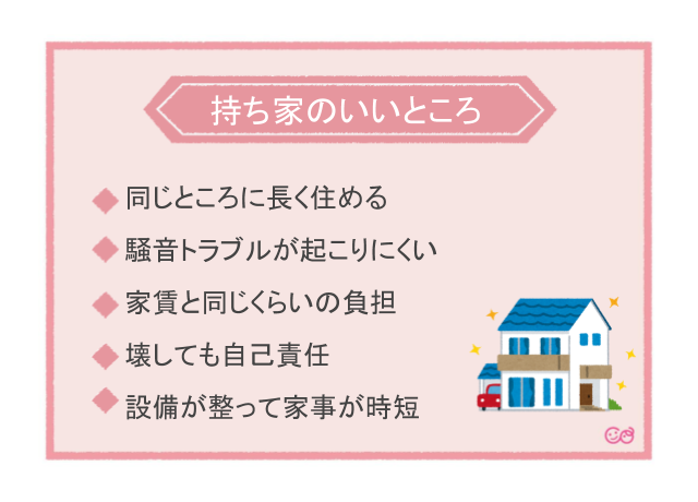 持ち家だと、一軒家の注文住宅の場合などは、家事導線を配慮した水回りや子育てしやすい間取りになります。
