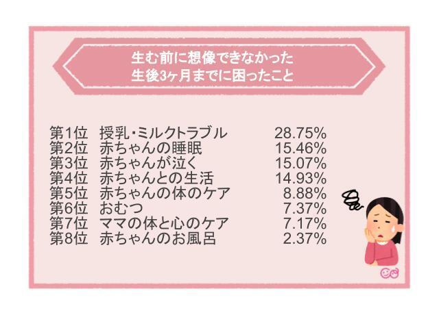 1500名以上の出産を経験したママに「生後3ヶ月までの間に生む前には想像つかなかったこと」を聞いてみました。28%以上の回答を集めたのが「授乳・ミルクトラブル」でした。