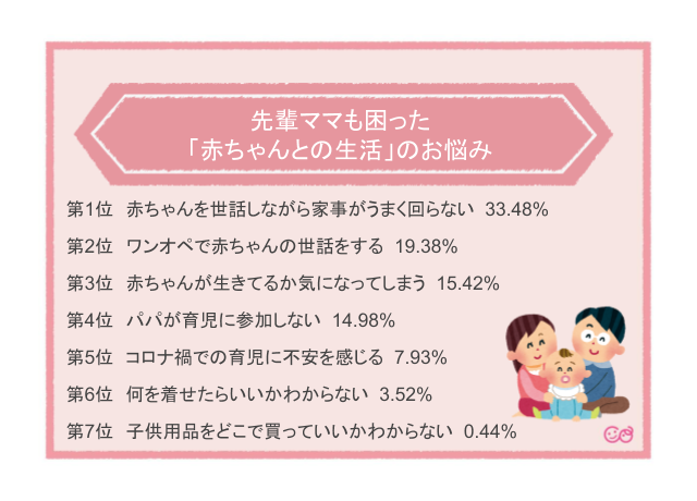 一番多かった回答が「赤ちゃんを世話しながら家事がうまく回らない」でした。赤ちゃんの世話にはママやパパがつきっきりのことがほとんどです。しかも産後1ヶ月は体も思うように動かず、トイレすらしんどいことも。