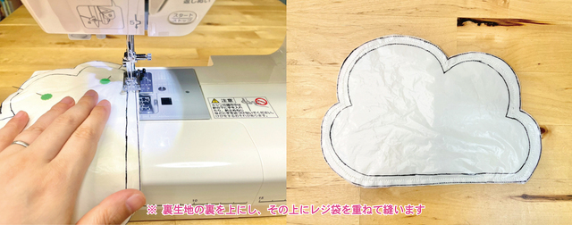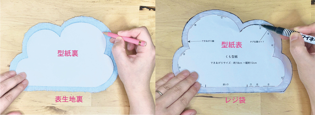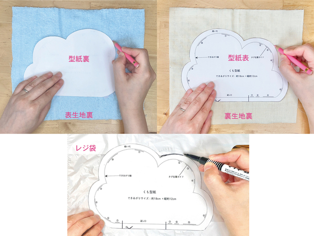 (1)Step2~3と同様の方法で、表裏2枚の生地に縫い代つきとの型紙線を写して生地を裁ち、できあがり線を写します。(2)表裏の生地をぴったり合わせ、輪にした⑥のリボンをはさんでまち針で留め、返し口を残して縫います。