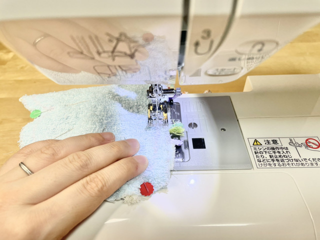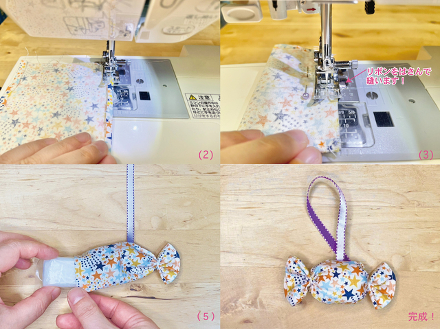 (1)型紙のサイズで生地をカット(2)生地を裏返し両端を5mmくらい折り、縫います。 手縫いの場合はできるだけ細かく縫いましょう。