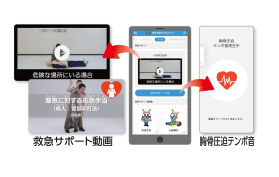 心肺蘇生や応急手当の方法を動画で見ることができる機能や、心肺蘇生を実施する際のサポートとなる胸骨圧迫テンポ音機能等のツールを搭載しています。