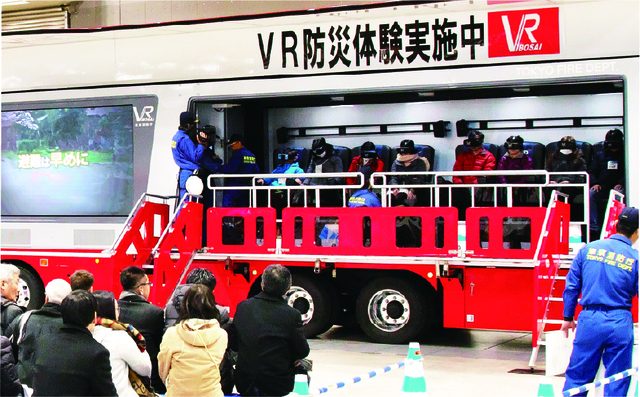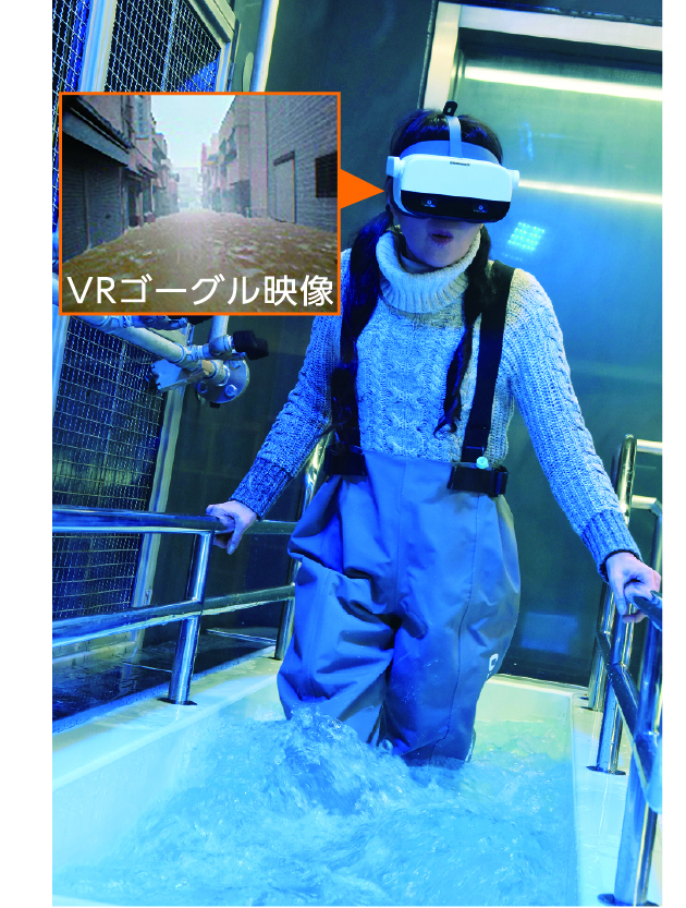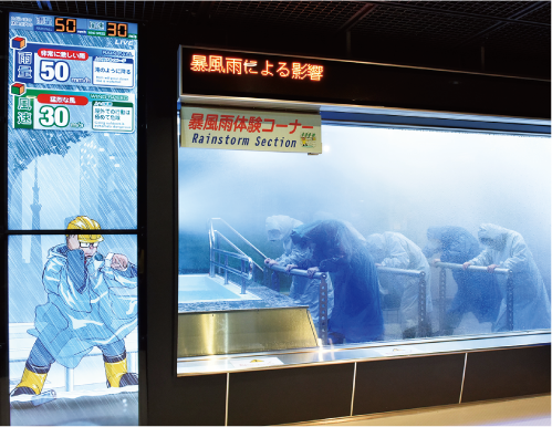 今春、本所防災 館に「浸水体験 コーナー」を新設 し「地震体験コー ナ ー 」をリニュー アルしました。「浸水体験コー ナー」は、浸水を 再現したプール 内でVRゴーグル を装着し歩行する ことで臨場感溢れる体験ができます。また、プロジェクション マッピングを使用した浸水状況体験ができ るようになりました。